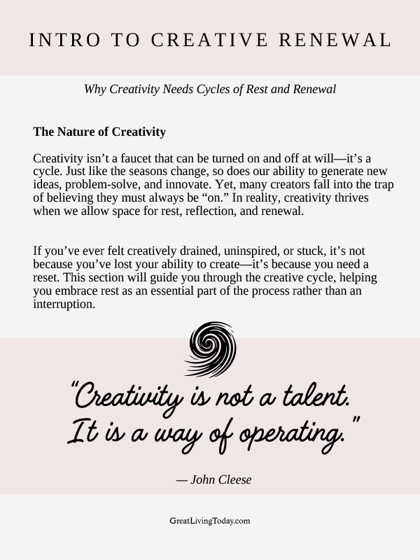If you’ve ever felt creatively drained, uninspired, or stuck, it’s not because you’ve lost your ability to create—it’s because you need a reset. This section will guide you through the creative cycle, helping you embrace rest as an essential part of the process rather than an interruption.
