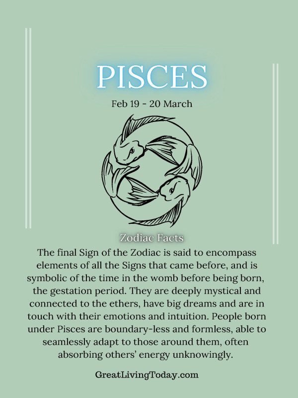 Pisces is a water sign known for its deeply intuitive, empathetic, and creative energy. Ruled by Neptune, it carries a dreamy, spiritual, and emotional essence, often associated with heightened sensitivity, artistic expression, and a strong connection to the unseen realms. Pisces energy encourages introspection, compassion, and a fluid approach to life, allowing for deep emotional connections and imaginative exploration.